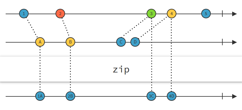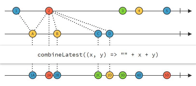 let sum = a.combineLatest(b, (aV, bV) => '' + aV + bV)Комбинирование потоков