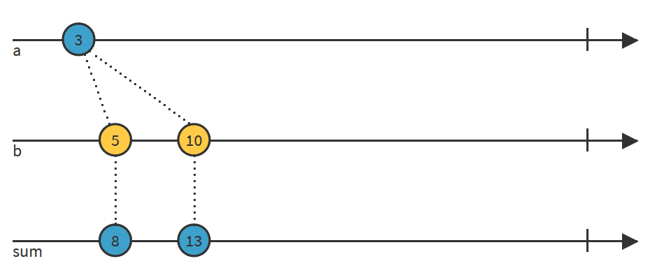 let sum = a.combineLatest(b, (aV, bV) => aV + bV) // let sum = a + b